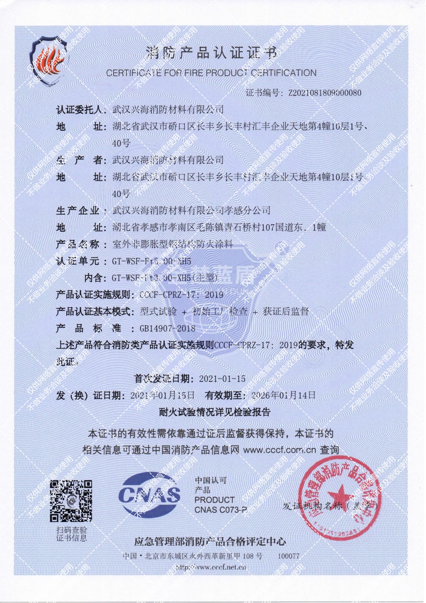 室外非膨脹型鋼結(jié)構(gòu)防火涂料消防產(chǎn)品認證證書