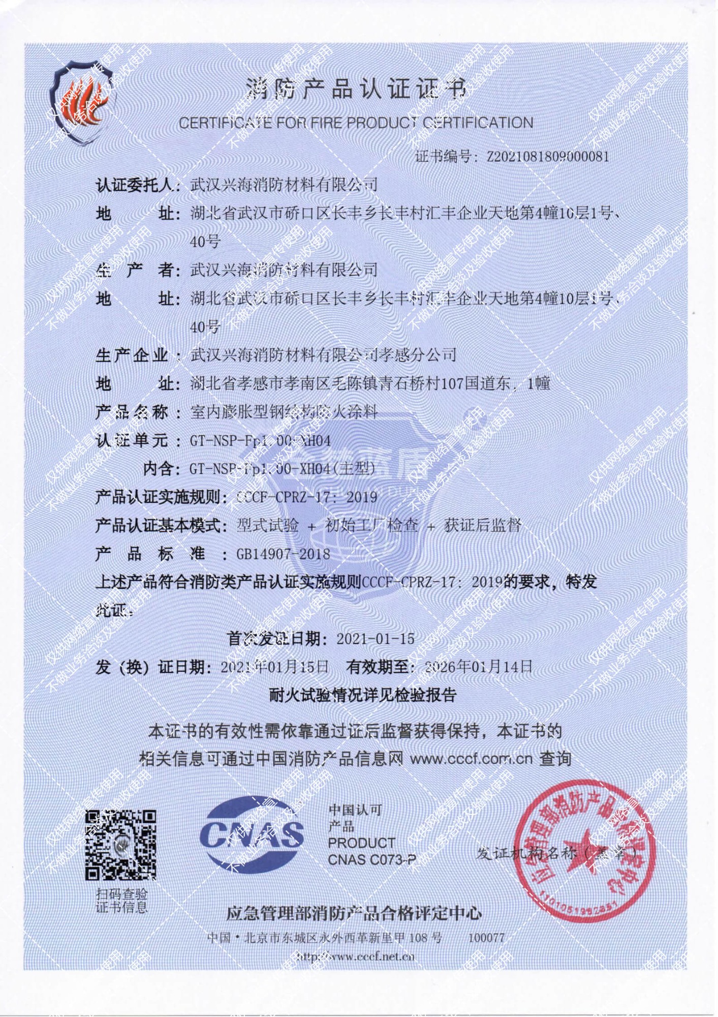 室內(nèi)膨脹型1小時(shí)鋼結(jié)構(gòu)防火涂料證書